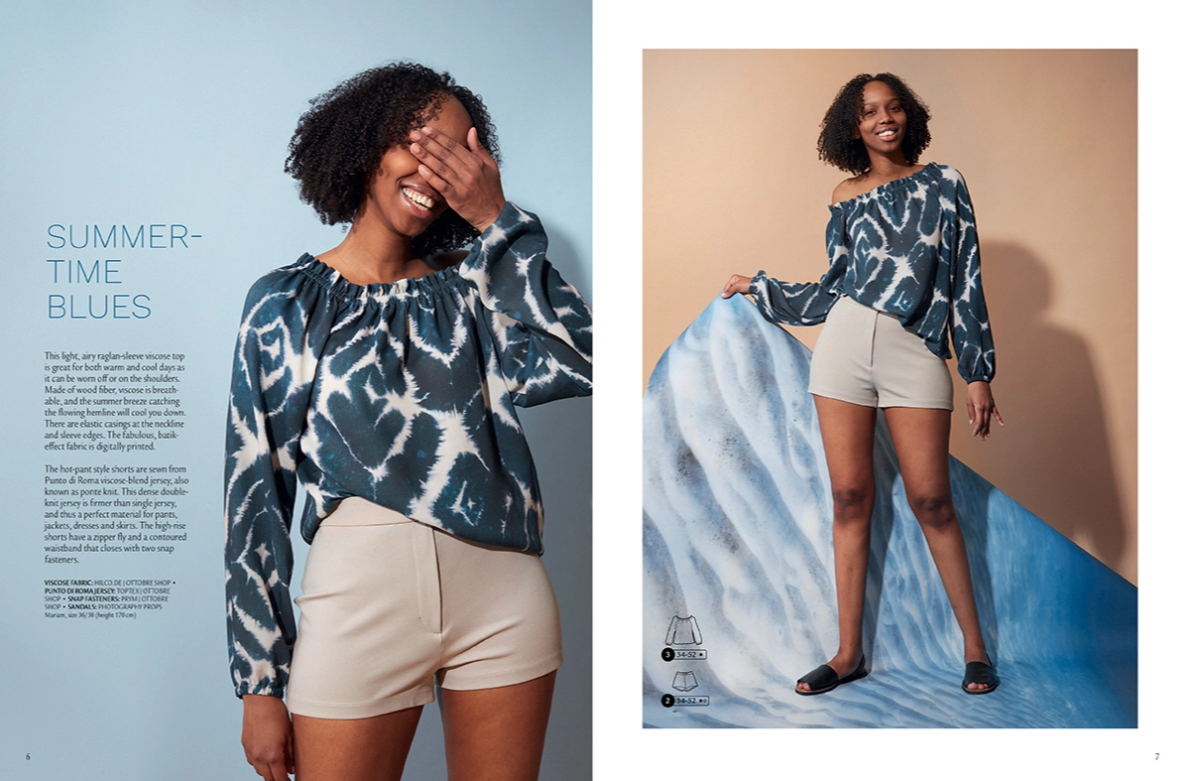Великолепная коллекция предметов одежды, прекрасно комбинирующихся друг с другом: футболка из льняного трикотажа, льняная куртка, шорты из трикотажа понте, блуза с горловиной на резинке и рукавами реглан, легкий топ, платье и брюки из вискозной ткани, замечательное платье-рубашка из хлопкового поплина, а также льняная шляпа с полями.