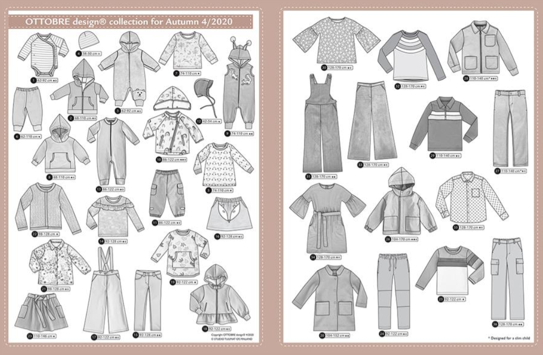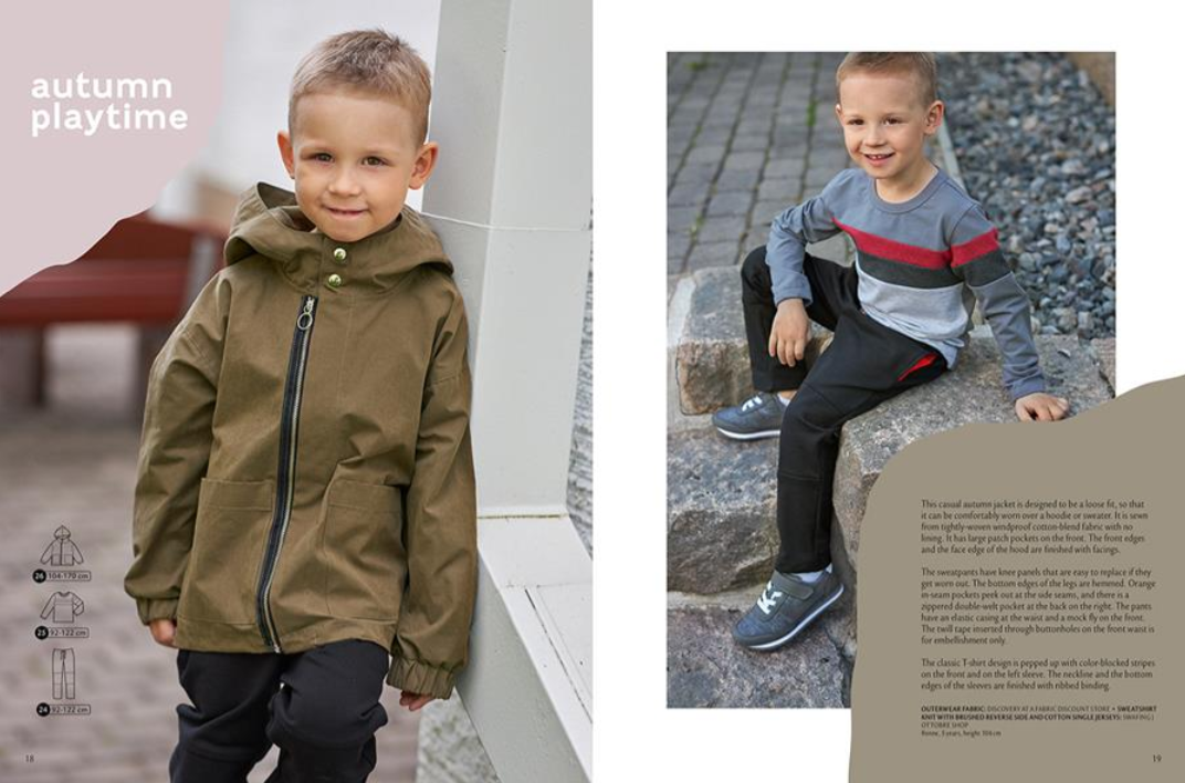 Практичные осенние модели в восхитительных цветах для малышей и дошкольников. Комбинезон из мехового трикотажа, боди с запахом, две толстовки, трикотажные брюки, шапочка-бинни, велюровый комбинезон без рукавов, куртка из софтшелла, непромокаемые брюки и вельветовая шапочка.