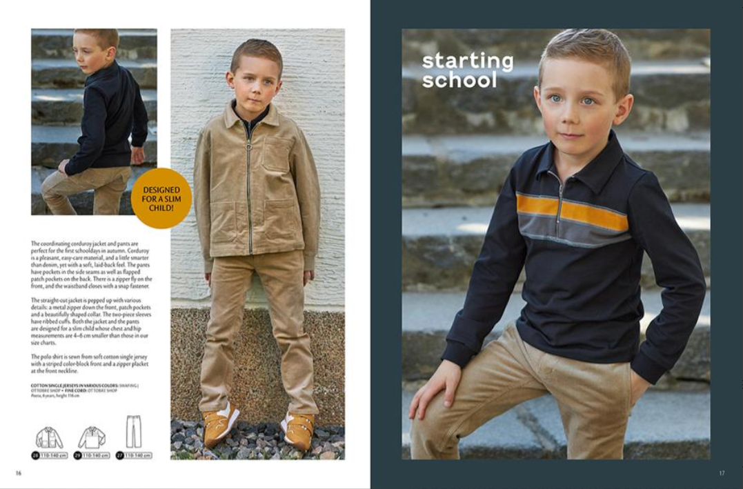 Оригинальные рисунки, деним и вельвет для школьников. Джинсовый комбинезон, вельветовые брюки, футболка с рукавами реглан, трикотажный топ с широкими рукавами, пальто из вареной шерсти, куртка, рубашка из поплина и брюки с накладными карманами.